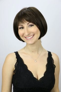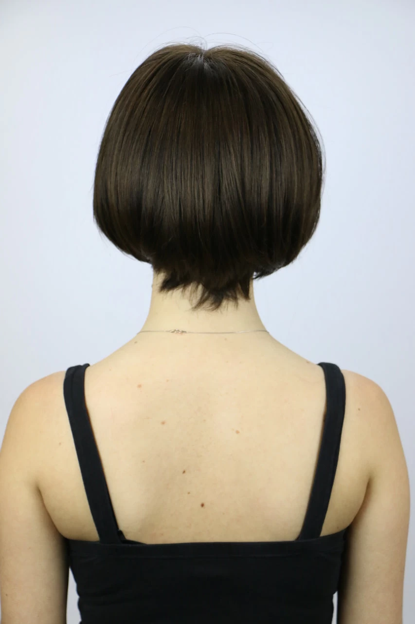 Shown in Dark Chocolate. Classic bob style wig to the chin with edged, shorter neckline in back. Monofilament means that each hair at the crown was sewn into the cap one by one. This is a time consuming task, and the result is a “see through” looking scalp.