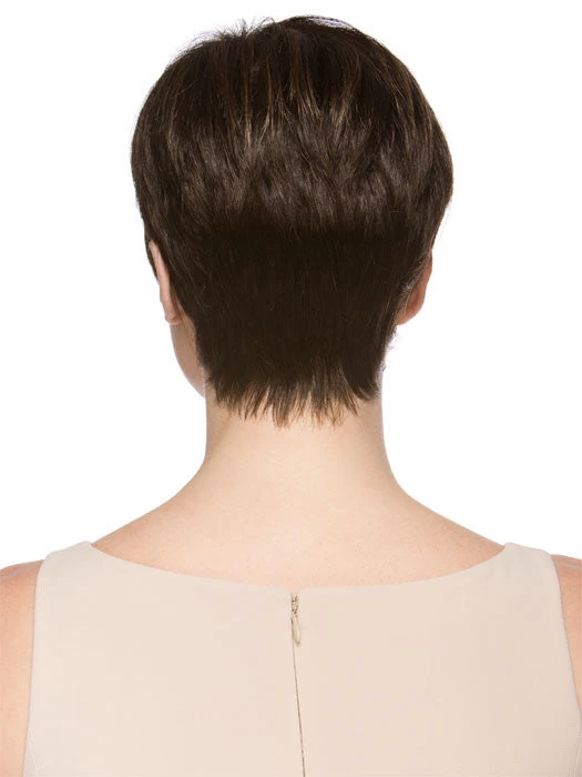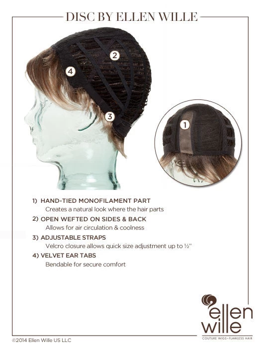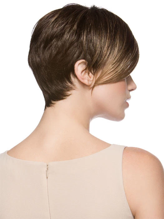 Disc features a short, asymmetrical boy cut with a soft, tapered neckline and angled fringe. This modern short wig features a monofilament left-side part, and is ideal for a petite to average head size. The density of the synthetic hair looks very natural and requires little to no customization or thinning.