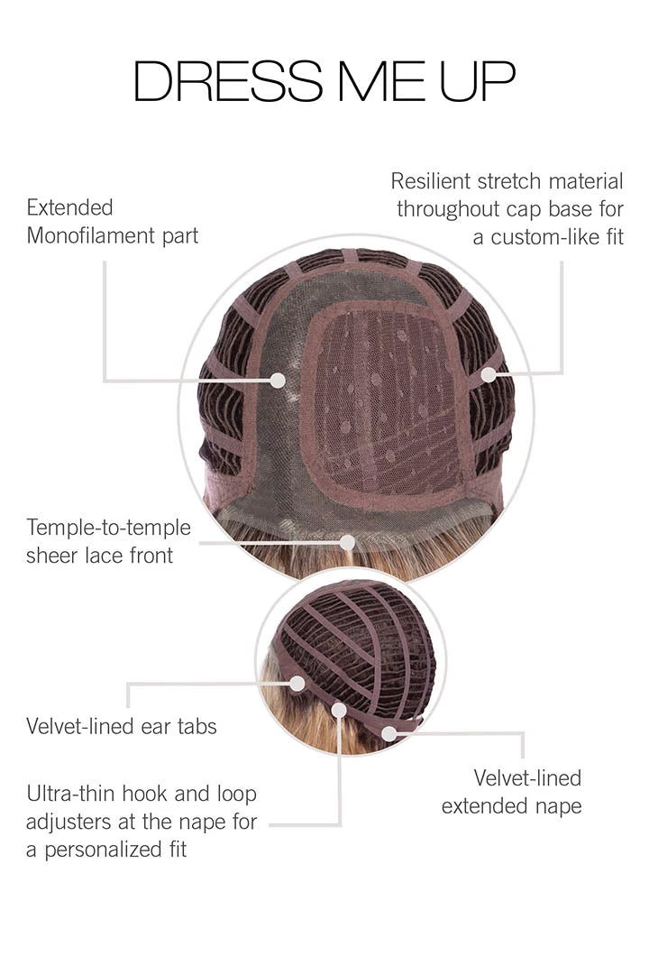 It’s today’s popular, soft tumbled wave texture professionally cut into a blunt, long bob. This unstructured, natural wave is in high demand, understandably so. With loose movement throughout, Dress Me Up is stylish but not over-styled. It is undeniably flattering whether dressed up or down. Meet your new wig wardrobe staple!
