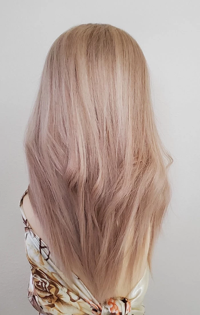 The hair texture is soft and straight with a slight wave after a wash.