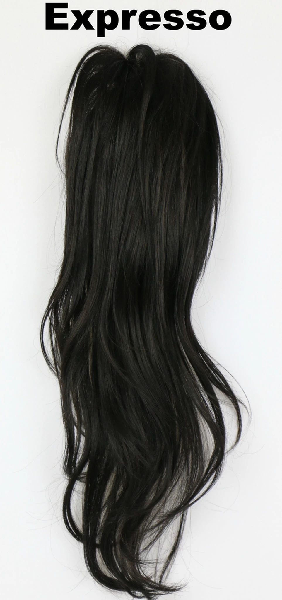 This top piece attaches with 4 metal wig clips; these clips will stay in even the thinnest and most slippery hair. Longest hair measures 18 inches.