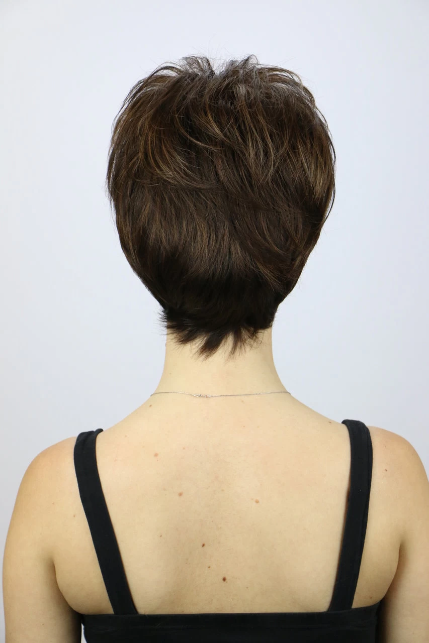 Shown in Coffee Latte. If you want an extremely light wig with a clean, tapered back and longer, wispy bangs, you’re going to fall in love with our Selma wig! The crown area is machine teased for just a hint of height. If you don’t want to wait for your grey to grow out, Selma in Silver Stone is just what the doctor ordered!
