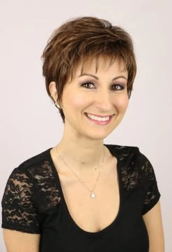 Shown in Toasted Brown. Large Sheila is a large size wig with a 23″ circumference. She is the perfect razor cut pixie wig. She is extremely light weight and comfortable. The soft wave in the layers gives it a chic, but fun look.
